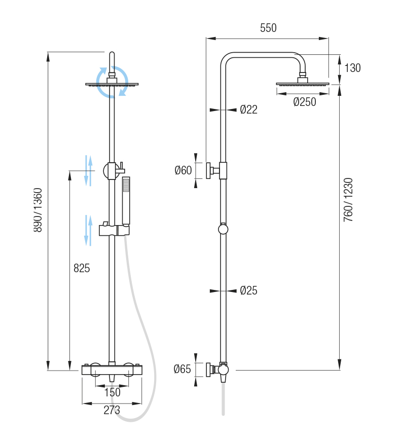 El rociador superior Ø25 cm, con rótula orientable, ofrece una experiencia de ducha relajante con efecto lluvia uniforme. Además, incluye un flexo extensible de Acero Inox 304 (150–180 cm) y un soporte deslizante y basculante que permite ajustar la posición del mango de ducha.