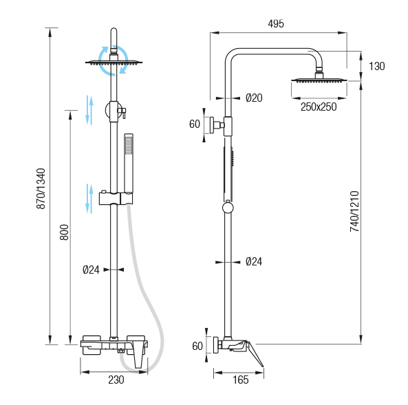La barra de ducha es extensible en altura (76–121 cm) y está fabricada en Acero Inox 304, ofreciendo resistencia y estabilidad. Incluye un distribuidor de 3 vías, que permite dirigir el agua hacia:
